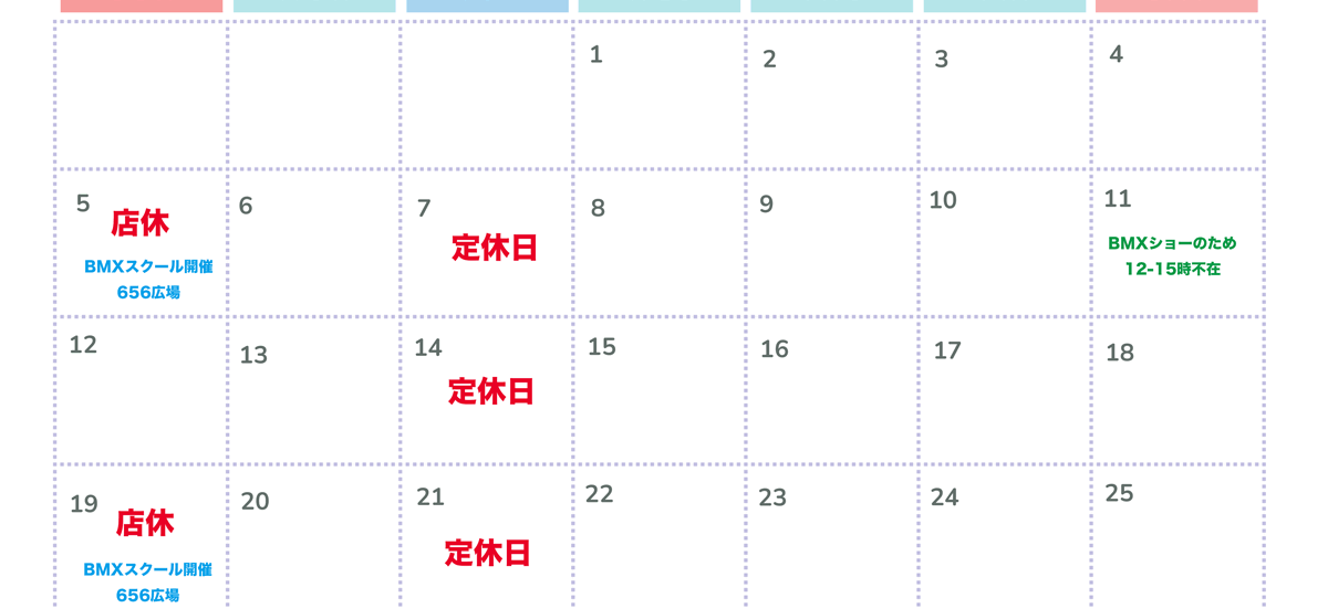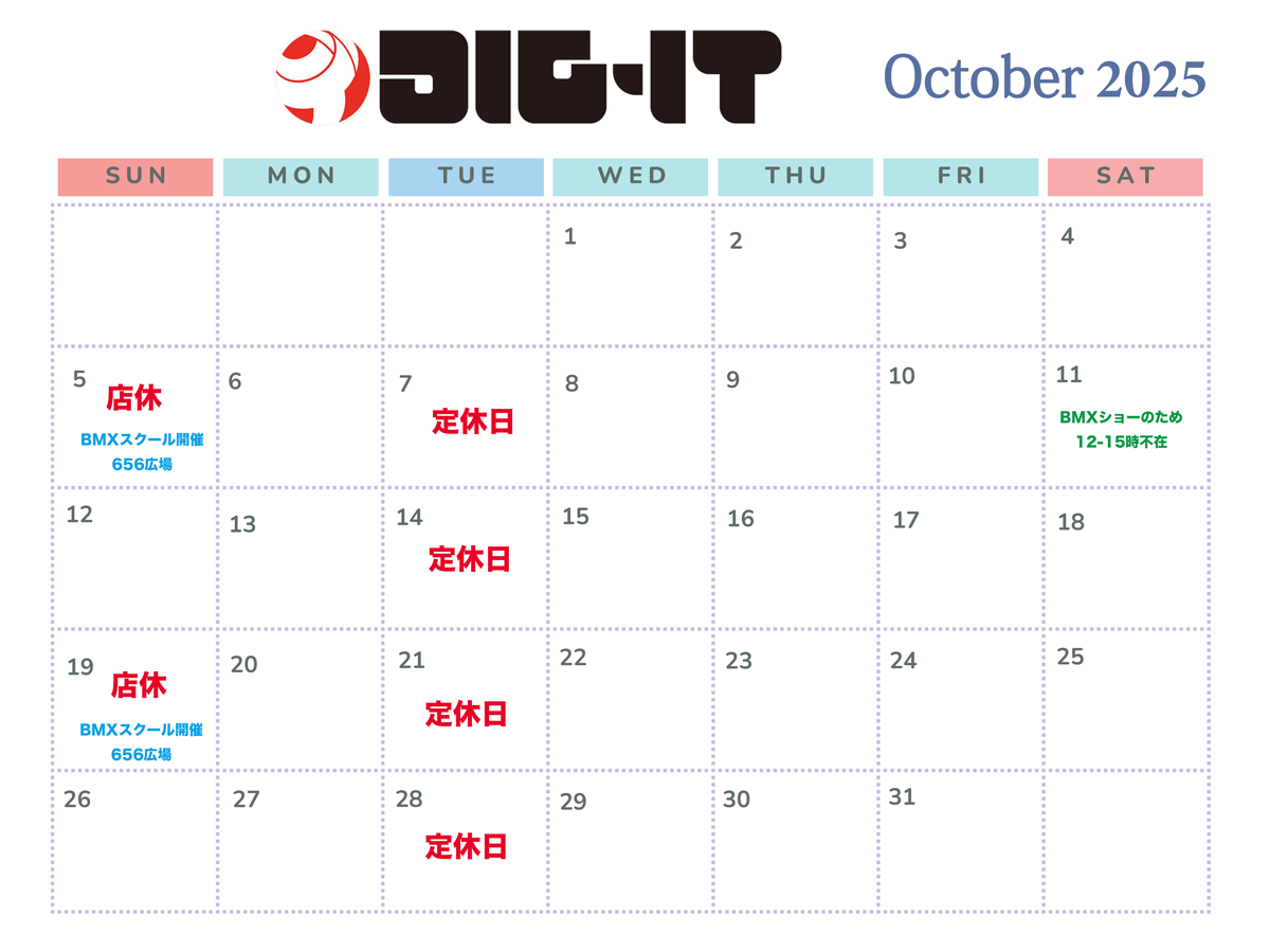 2025年10月のDIG-IT BMX店舗の営業日カレンダーです。通常営業時間は10時から19時、水 続きを読む