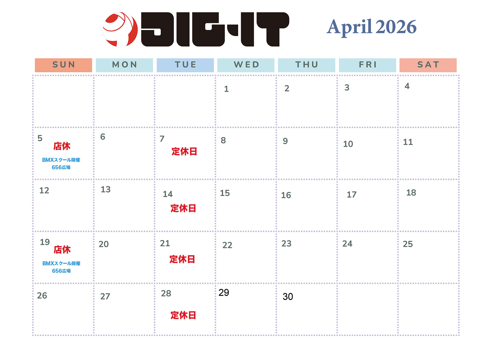 2026年4月のDIG-IT BMX店舗営業日カレンダーです。通常営業時間は10時から19時、水曜日 続きを読む