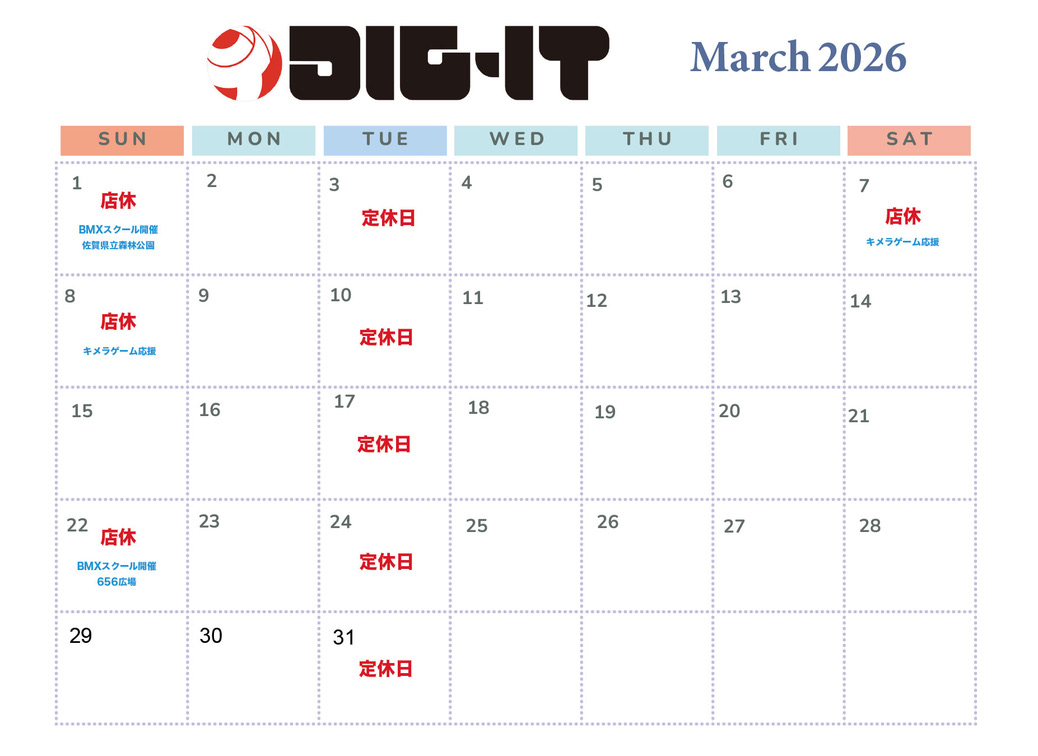 2026年3月のDIG-IT BMX店舗営業日カレンダーです。通常営業時間は10時から19時、水曜日 続きを読む