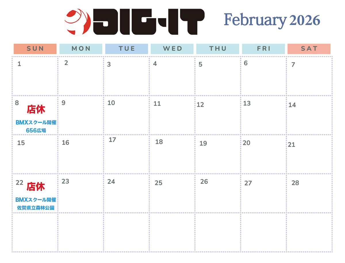 2026年2月のDIG-IT BMX店舗の営業日カレンダーです。通常営業時間は10時から19時、水曜 続きを読む
