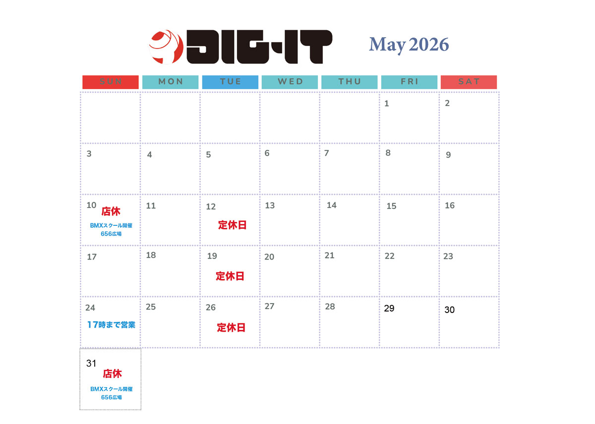 2026年5月のDIG-IT BMX店舗営業日カレンダーです。通常営業時間は10時から19時、水曜日 続きを読む