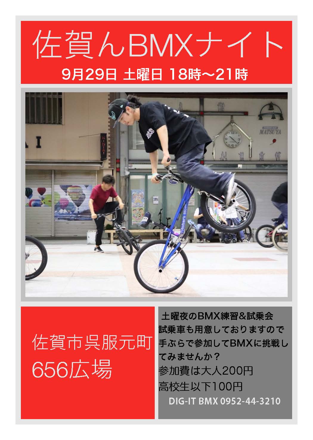 土曜日の夜のBMX練習会とBMX体験試乗会が「佐賀んBMXナイト」です。 次回は9月29日土曜日18時〜21時 佐賀市呉服元町656広場で開催します。 試乗車(大人用も子供用も)を用意しておりますので 手ぶらでBMXを体験に来られませんか? 参加費は大人200円、高校生以下100円です。