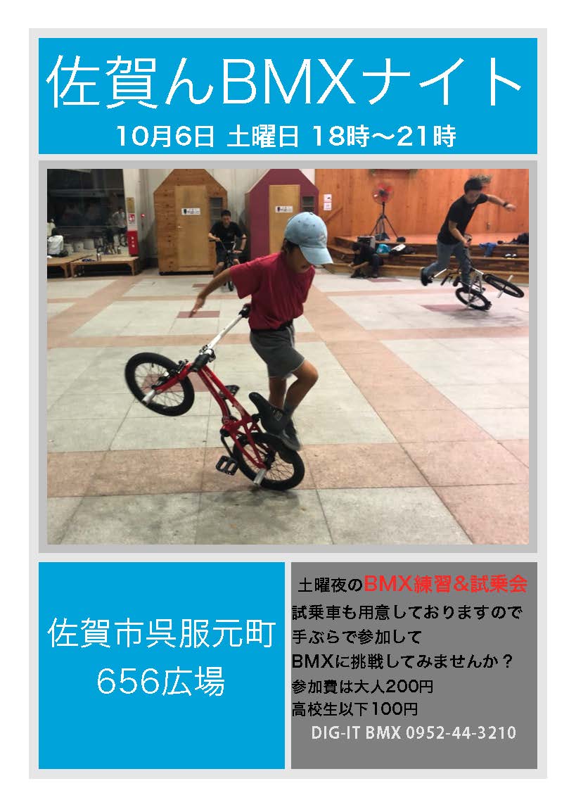 土曜の夜のBMX練習会 BMX試乗会 「佐賀んBMXナイト」 次回の開催は10月6日 18時〜21時 佐賀市呉服元町656広場です。