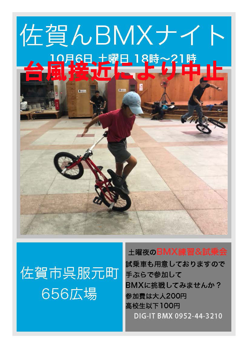 台風25号の接近により明日10月6日土曜日に予定しておりました 佐賀んBMXナイトは中止とさせて頂きます。