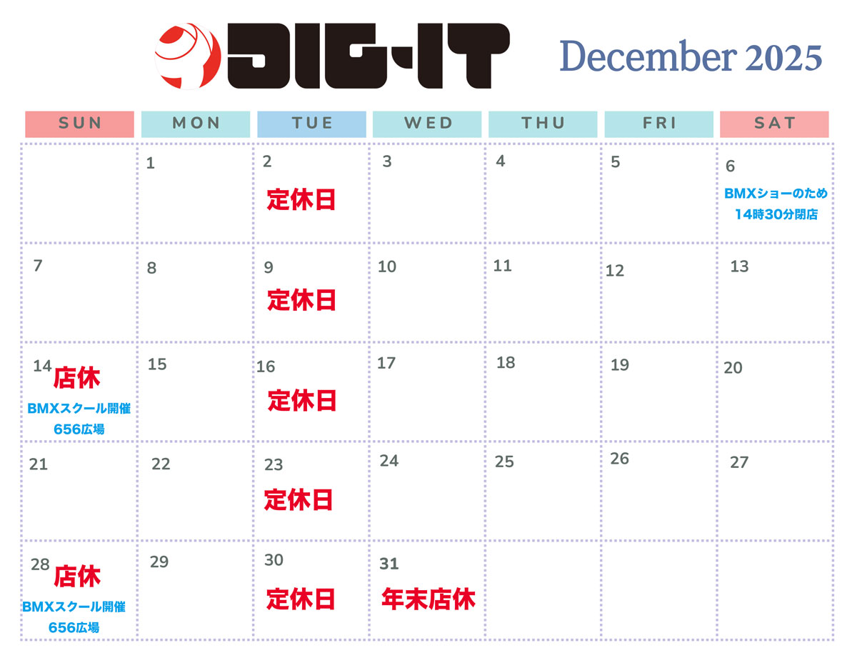 2025年12月のDIG-IT BMX店舗の営業日カレンダーです。通常営業時間は10時から19時、水 続きを読む