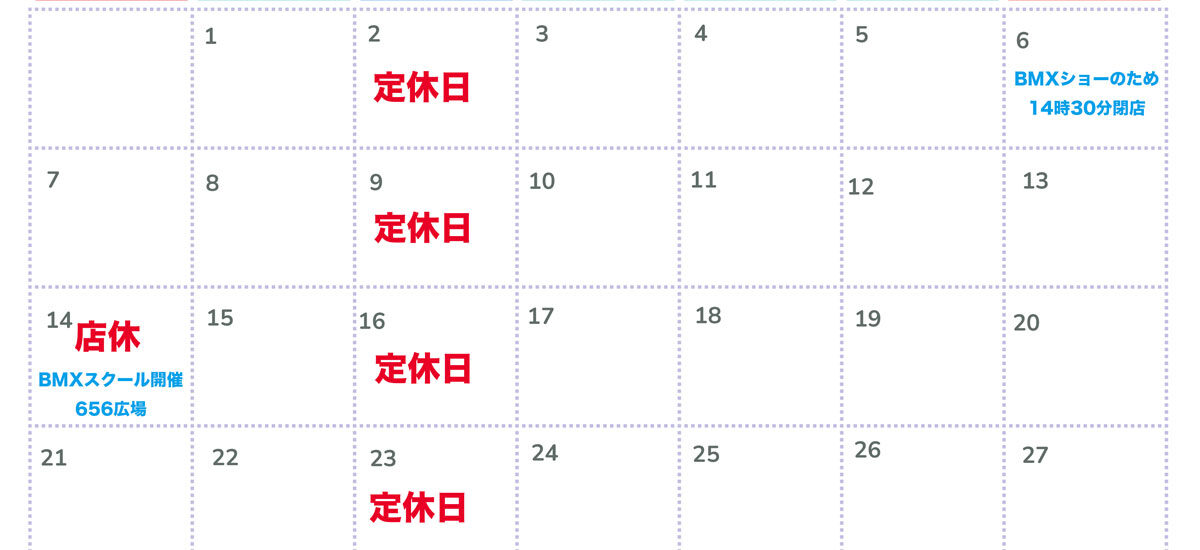 2025年8月のDIG-IT BMX店舗の営業日カレンダーです。通常営業時間は10時から19時、水曜 続きを読む