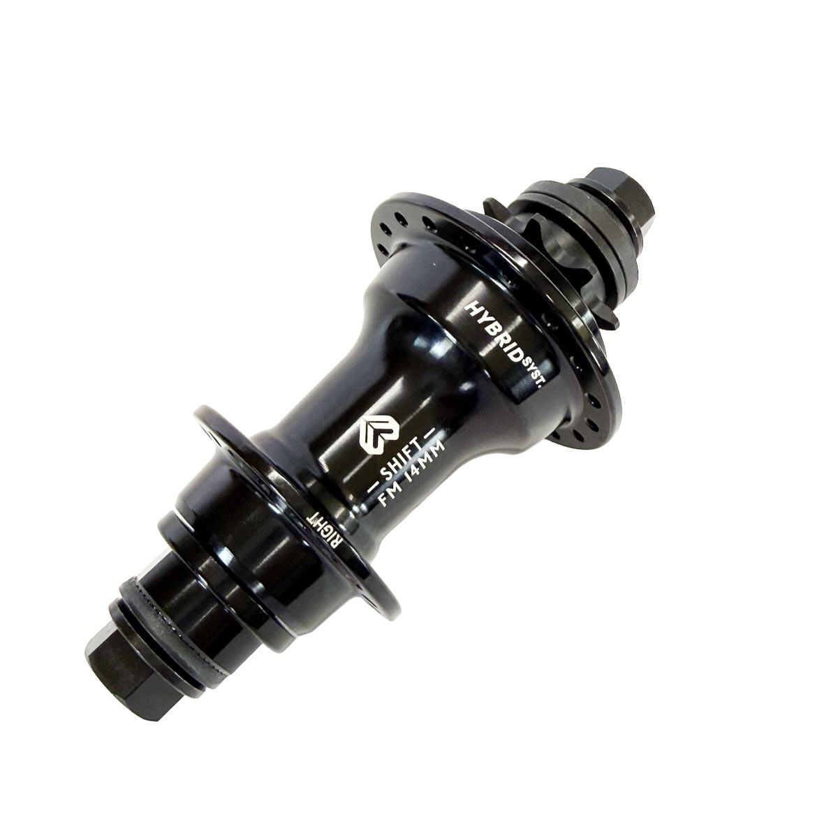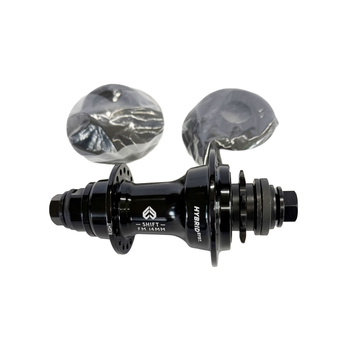 軽量なフリーコースターシステムとして、ストリートライダーにもフラットランドライダーにも評価を得るHYBRID SYSYTEMのSHIFT HUBの14mmボルト仕様。